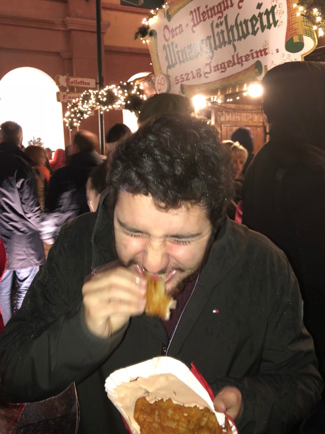 This year I don’t want to cruise through the Christmas season. I don’t want to enjoy just enough cheer and just enough holly-jollies to barely make it to February without already forgetting what happened in the month-long haze of meats, cheeses, desserts, and wine that we call the “Holiday Season” proper. So for posterity’s sake, my exploits this season will be captured in the form of this series: 14 Days of Weihnachtsmarkt, wherein each day of the first two weeks leading up to Christmas (I am taking a small trip on the 15th), I will try a different food at the local Christmas Market in Mainz, Germany where I am studying. So, let the indulging begin.