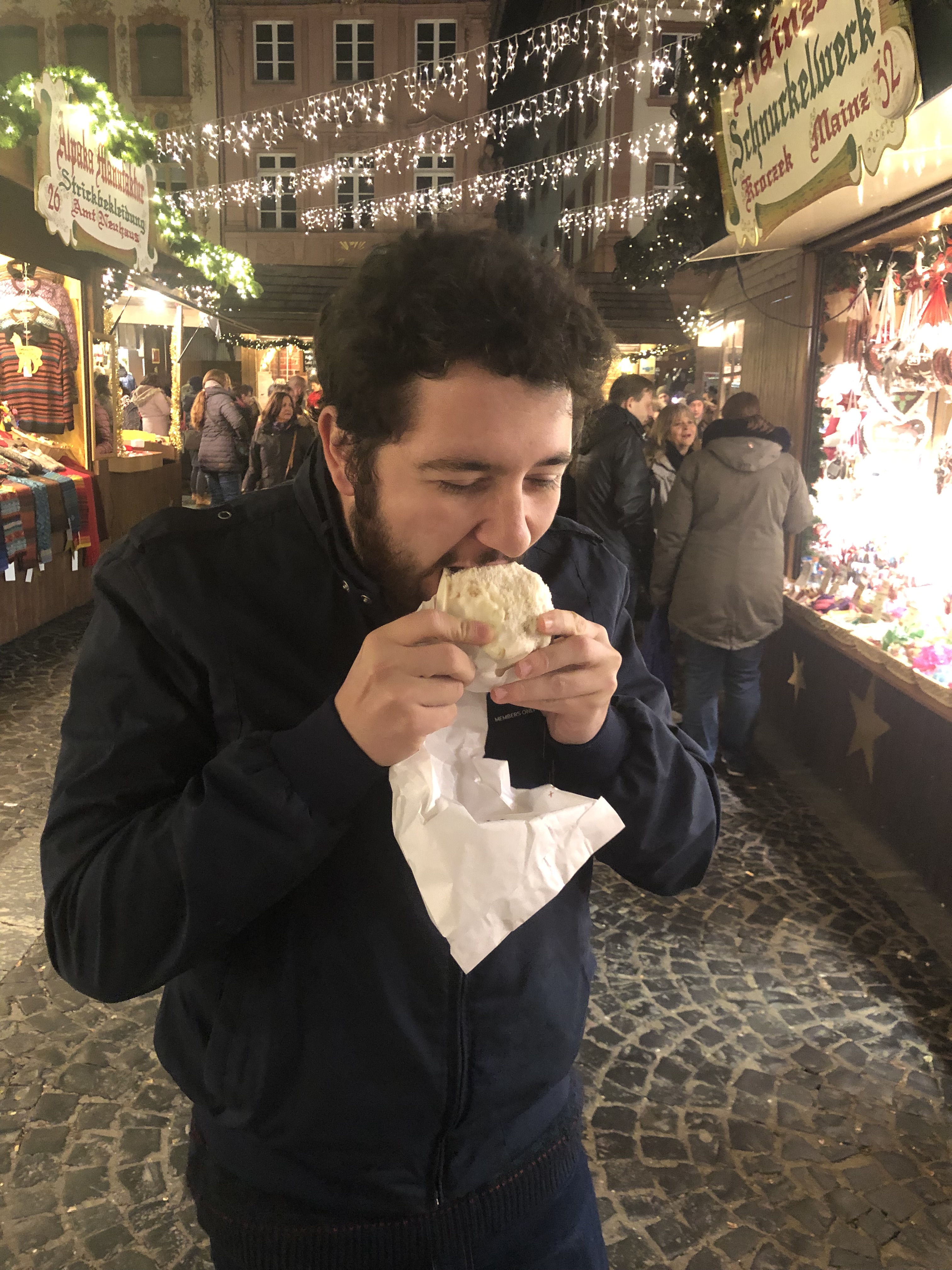 There was a pool party once where they had these things called “cake-pops.” They were little balls of cake on a stick with a semi-hardened icing exterior. When I tried one of these pops, I believe I remember immediately getting changed into dry clothes, sitting down next to them, and eating them by myself for the rest of the night. They were so moist on the inside (why do people hate that word? The cake was moist. What else am I supposed to say? Wet?) and the icing was creamy on an epic level. They were amazing. Now back to the present. I had been walking around the Weihnachtsmarkt for a week now, always passing a curious little stand selling “Schneebälle,” or snowballs. They looked just like these cake-pops I remembered so fondly, but even bigger. I hadn’t tried any desserts up until that point, and my sweet-tooth was raging. It was time; I ordered one.