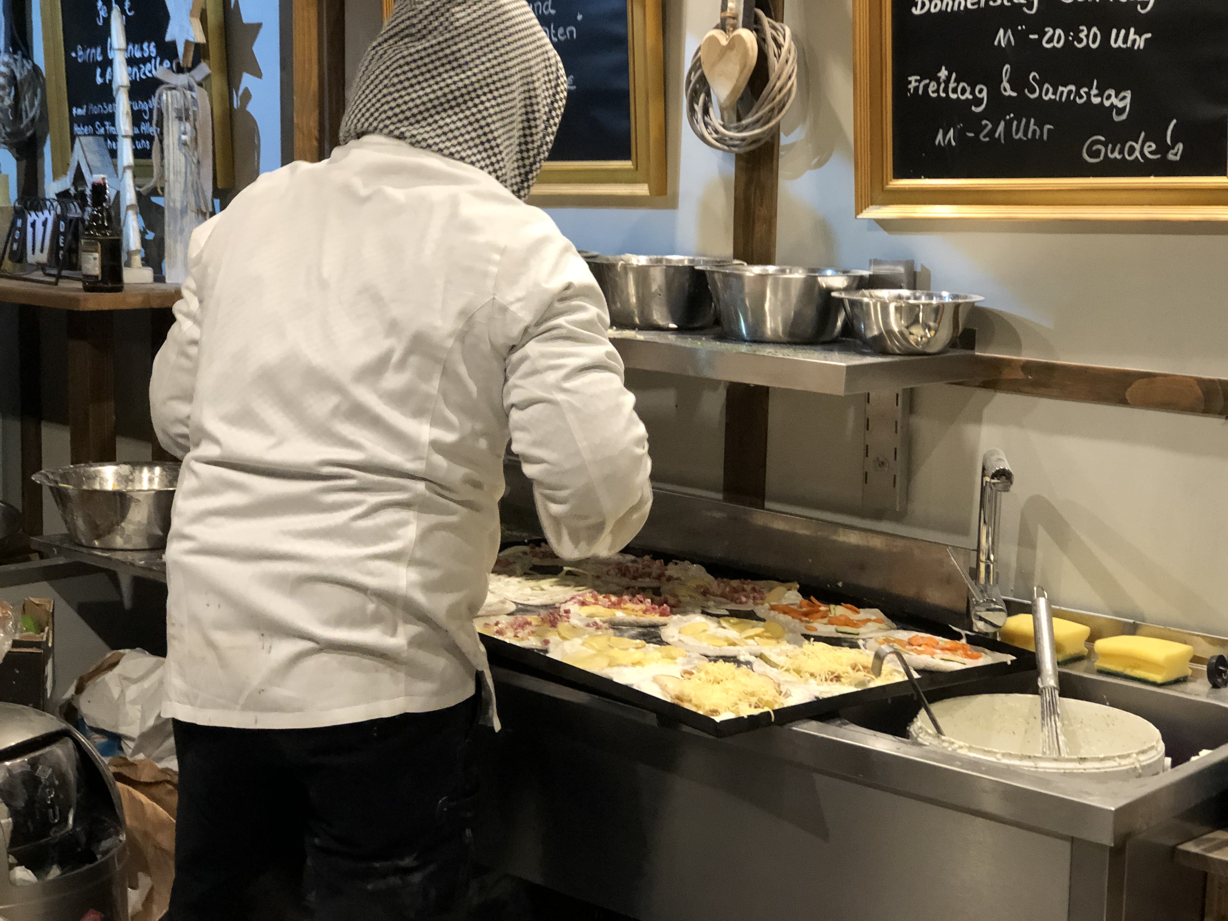 There was one question floating through my mind the night of December 8th. As I approached the counter of the Dinnele stand, I wondered, “can anything be worth this wait?” The Weihnachtsmarkt is about quick release, instant gratification, and snap indulgences. The Dinnele hut, however, routinely has lines stretching throughout the market. Some poor souls have, according to legend, even waited for longer than an hour to receive the pizza-like delicacy. Indeed, Dinnele is merely a thin bread dough topped with a sour cream-type sauce as the first layer, followed by onions and Appenzeller cheese (an herbal brine cheese originating in Switzerland). This dish is of course not to be confused with Flammkuchen, another thin-crust pizza variation (to be tried later). So, as the timer on my phone passed the 24 minute mark and I finally approached the counter, I was very curious about the hype. The counter looked like this: