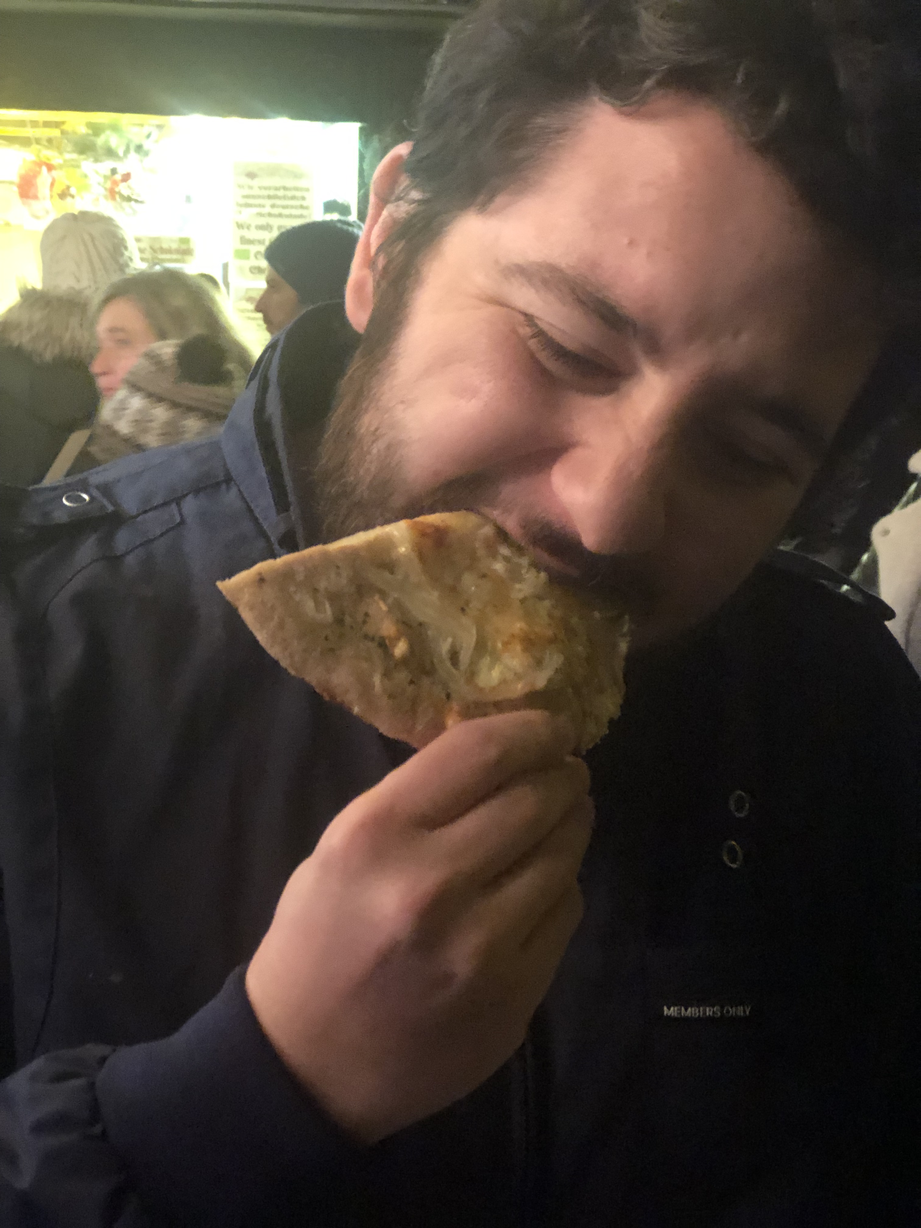 There was a large bell the workers would ring the moment a new batch was ready. They would shout at each person in front of the counter, begging each citizen to accept whatever variation of Dinnele had just emerged from the oven. It was chaos. Finally, after 26 ice cold minutes, I emerged into the Market, Dinnele in hand, ready to experience the magic. Was it worth it?