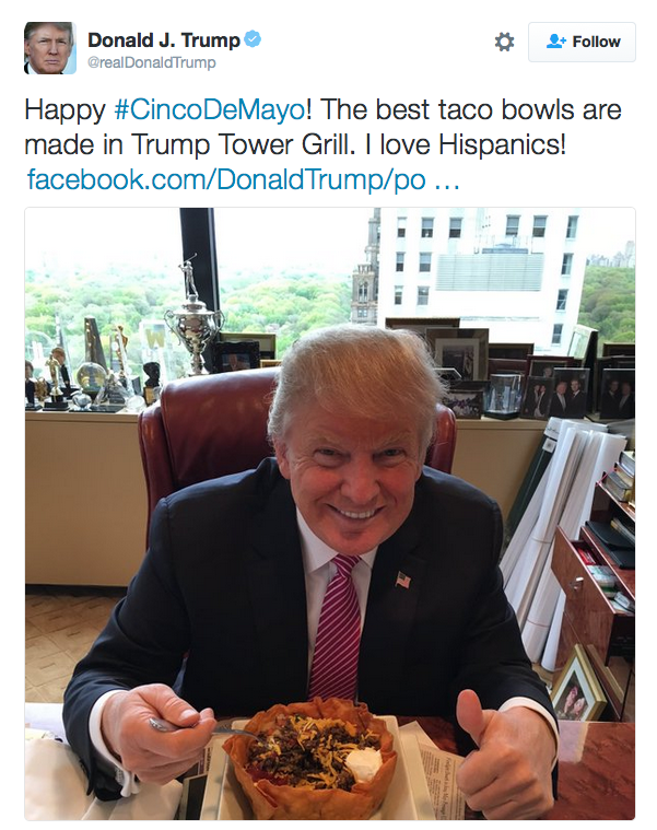 Turning back to Trump, then, one can see this concept of forced choice incompleteness present itself in the political sphere. This is possible only through trolling. The example Melber uses in the MSNBC video will be the same example used here. To prove his point, Melber presents Trump’s infamous Cinco de Mayo tweet, wherein the president writes, “Happy #CincoDeMayo! The best taco bowls are made in Trump Tower Grill. I love Hispanics!” and in which there is a linked photograph of Trump smiling while eating a taco bowl (see fig. 1.).