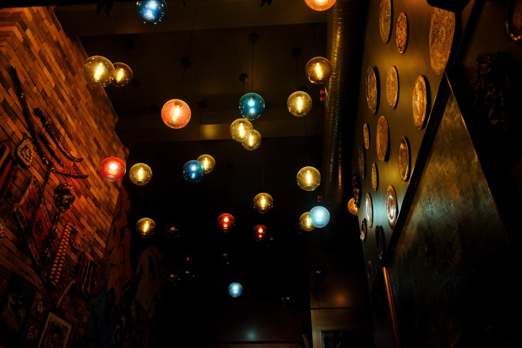 This bar in Frankfurt, called Terminus Klause, straight up kept all the décor from the burger joint they snaked in after. Except, in every open space they could, they pinned up trinkets and china and pictures from Turkish culture, so that on one end you have Andy Warhol-derivative murals of Marilyn Monroe and on the other end a stone decorative sheep. It’s hilarious. You can kind of see what I mean in this picture below. The quirky fun colorful lights hang from the high ceiling to illuminate a cascade of Turkish china simply nailed to the wall. What you don’t see, and which hides just out of frame to the left, under the swords, is a large canvas painting of Mickey Mouse. I truly, truly cannot get enough.